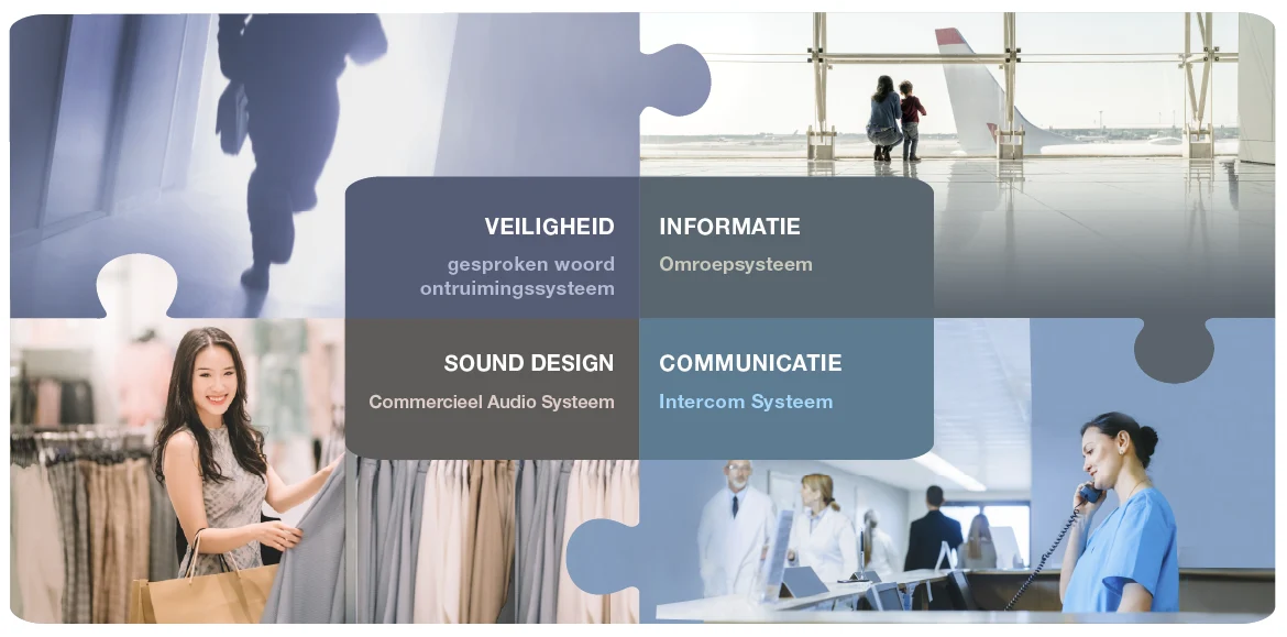 Onze systemen integreren en sluiten naadloos op elkaar aan om te zorgen voor veiligheid, informatie, communicatie en geluidsontwerp - in noodgevallen of voor comfortabel dagelijks gebruik.